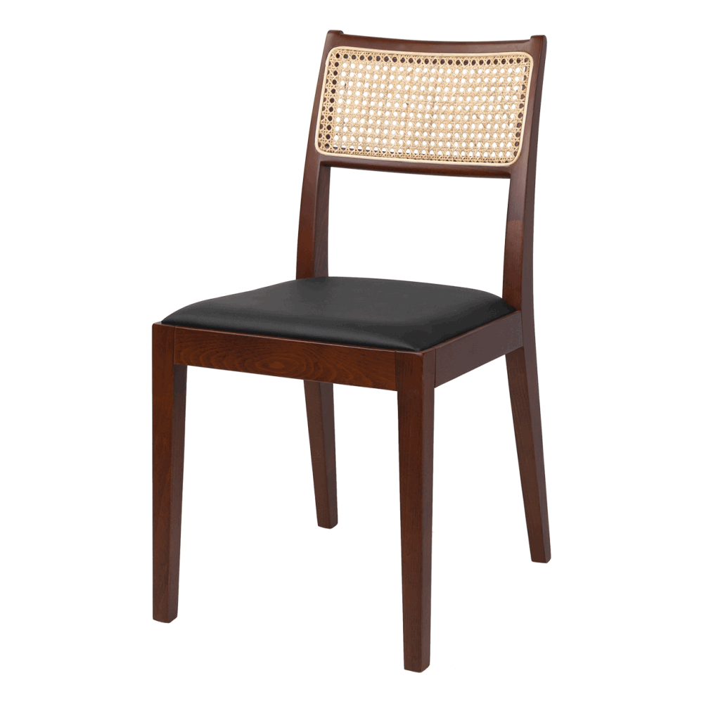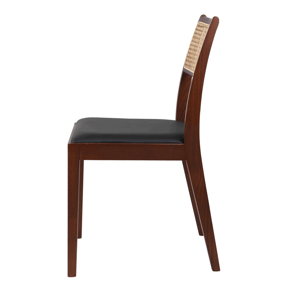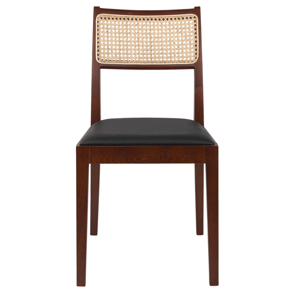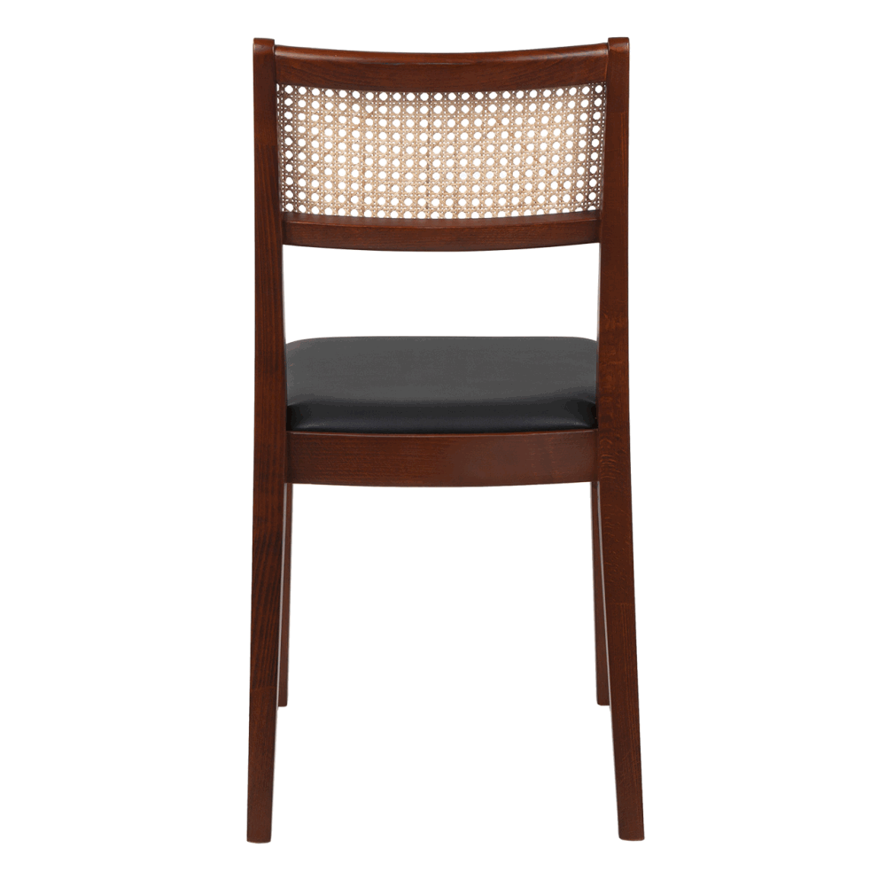 Спинка оформлена плетёным ротангом — лёгким и при этом устойчивым материалом, обеспечивающим хорошую вентиляцию и визуальную невесомость. Сиденье обито мягкой экокожей в коричневом тоне: практичный, приятный на ощупь материал устойчив к загрязнениям и истиранию.