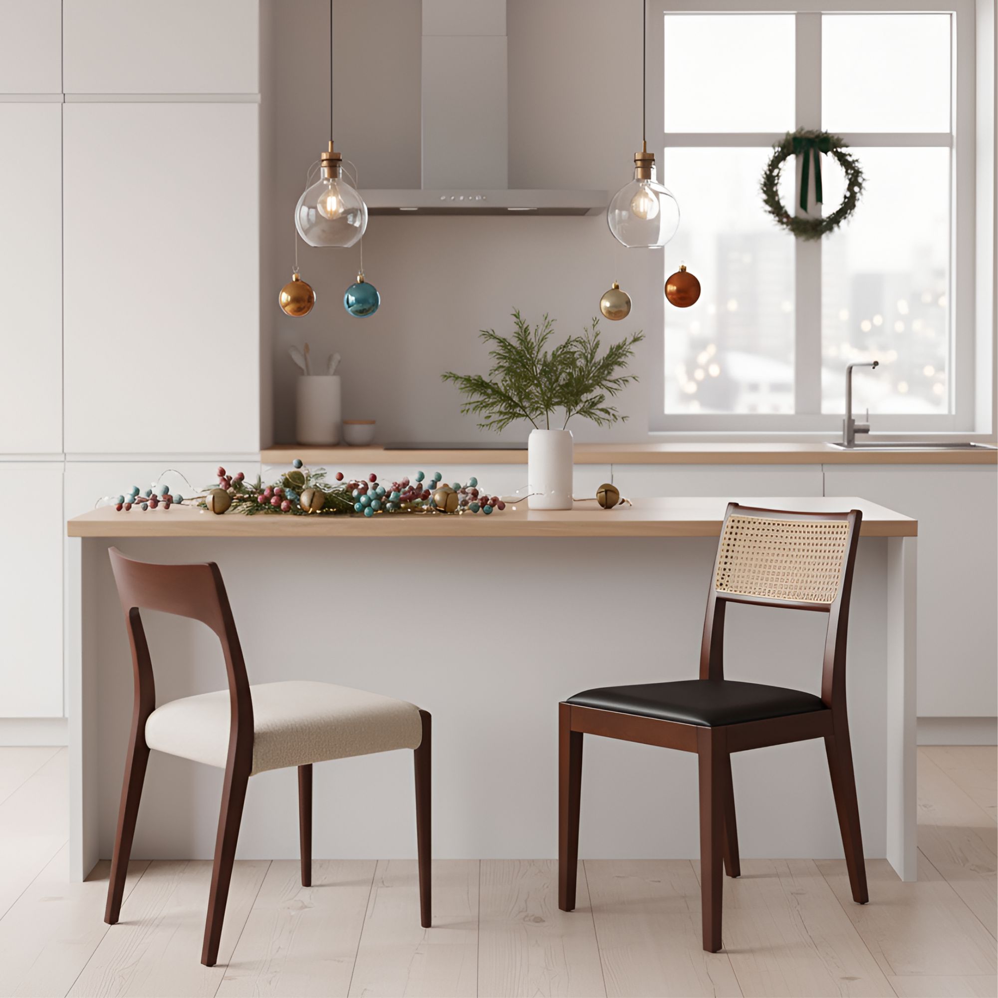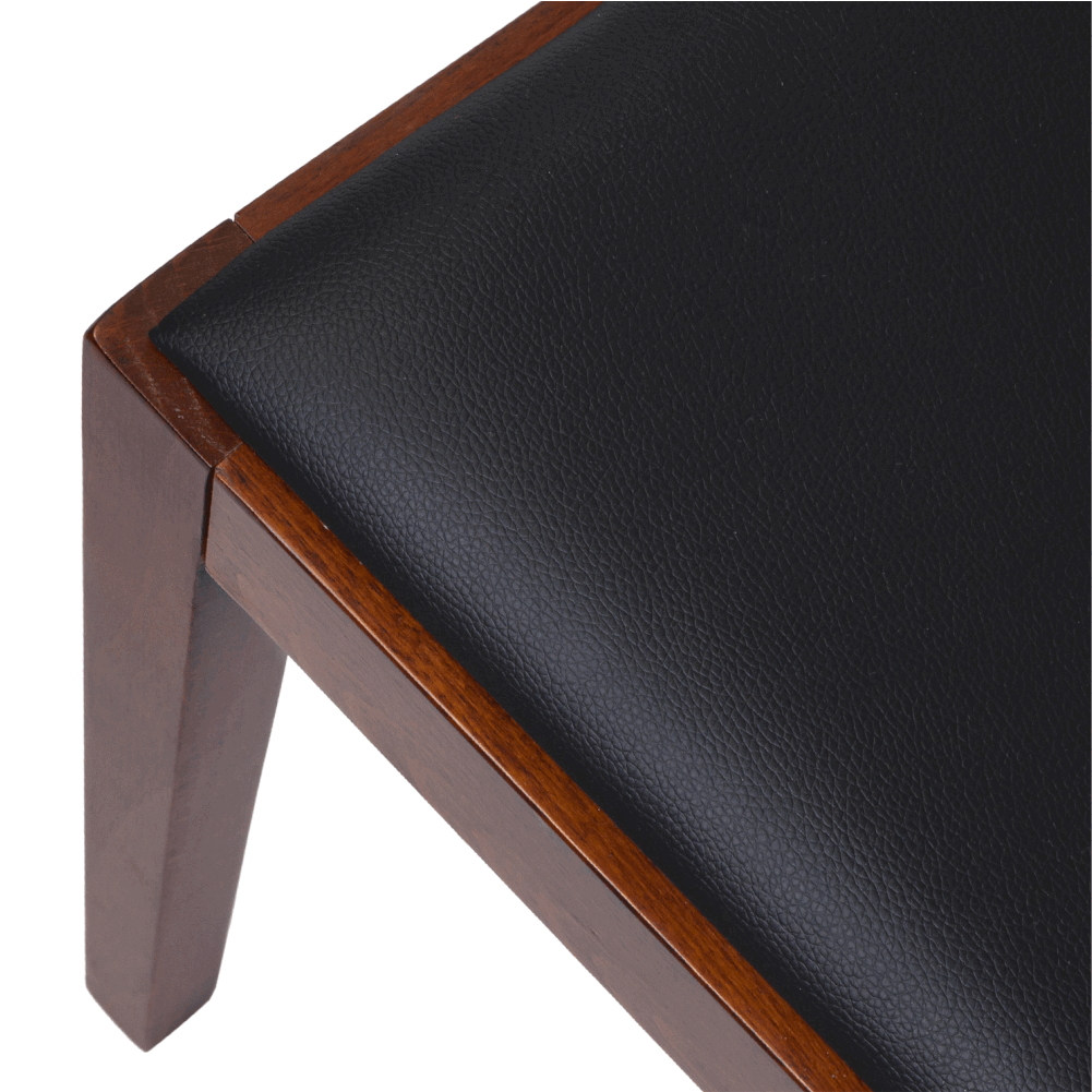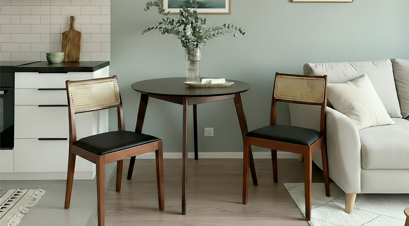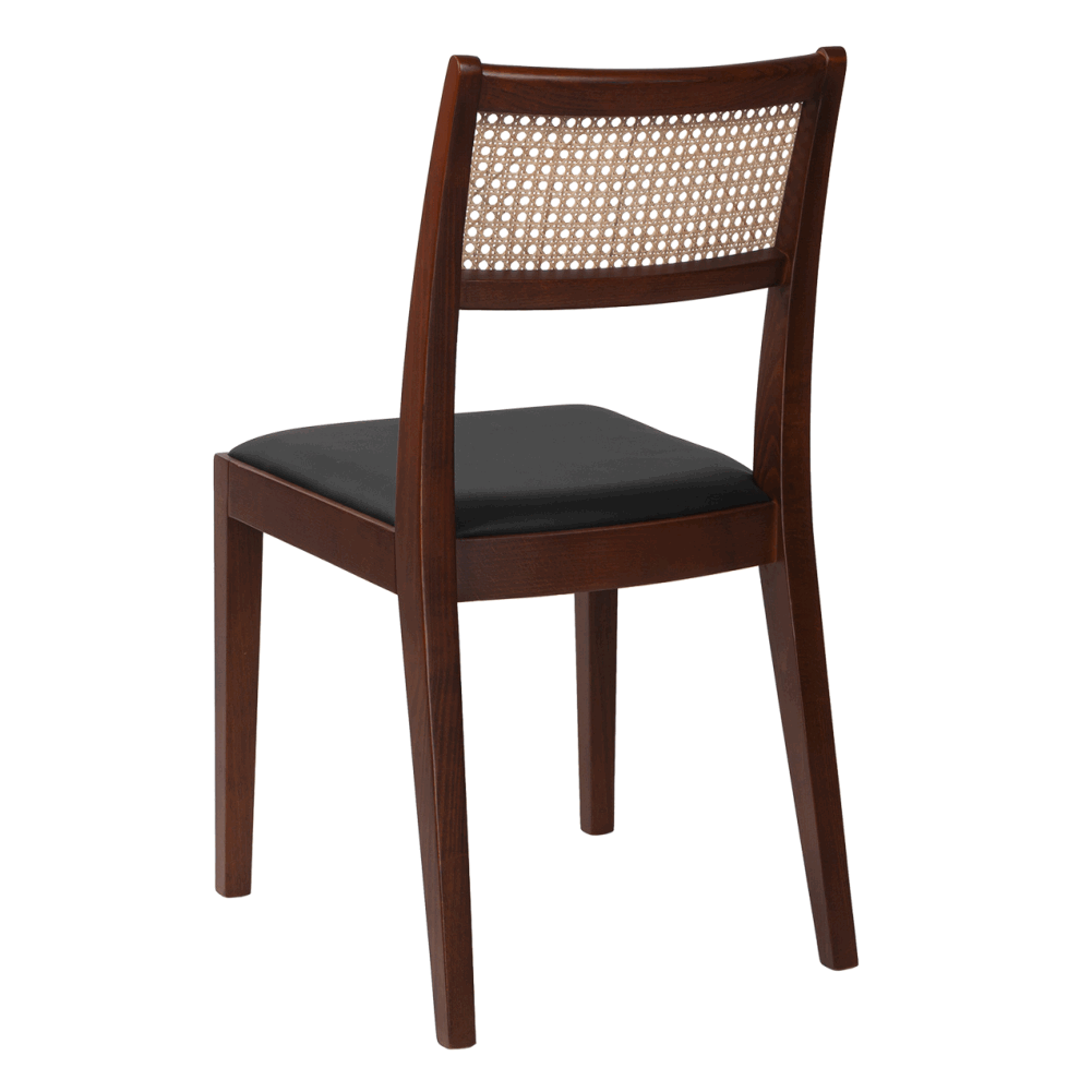 Спинка оформлена плетёным ротангом — лёгким и при этом устойчивым материалом, обеспечивающим хорошую вентиляцию и визуальную невесомость. Сиденье обито мягкой экокожей в коричневом тоне: практичный, приятный на ощупь материал устойчив к загрязнениям и истиранию.