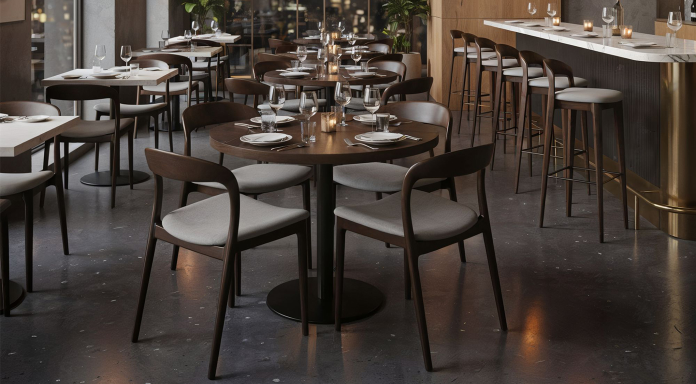 Обивка из бежевой экокожи придаёт модели сдержанную элегантность и делает стул практичным для ежедневного использования. Материал устойчив к влаге и легко очищается, что особенно актуально в условиях высокой проходимости — кафе, баров, офисов.