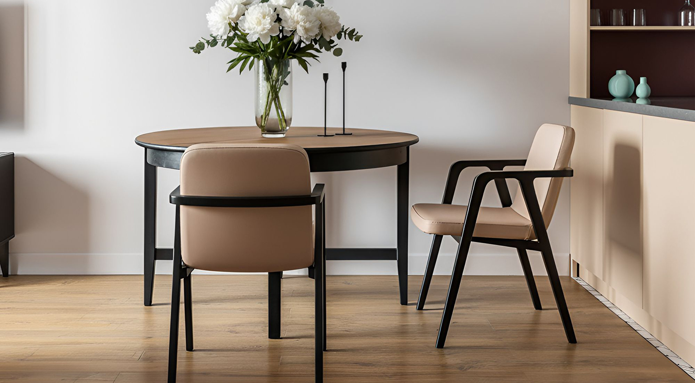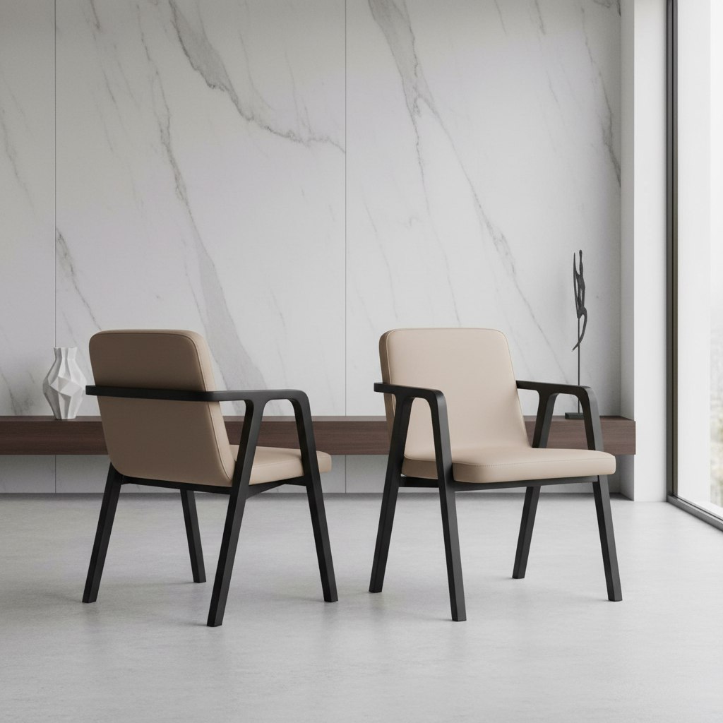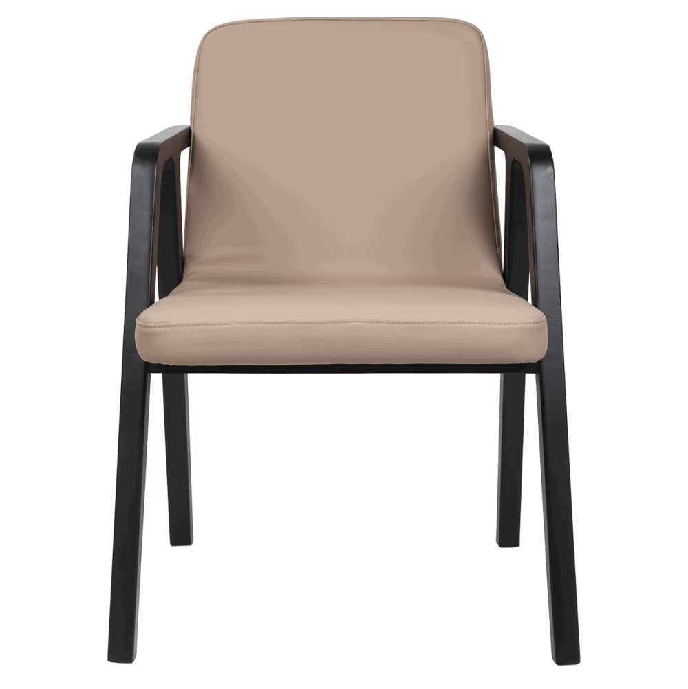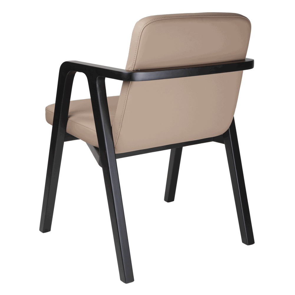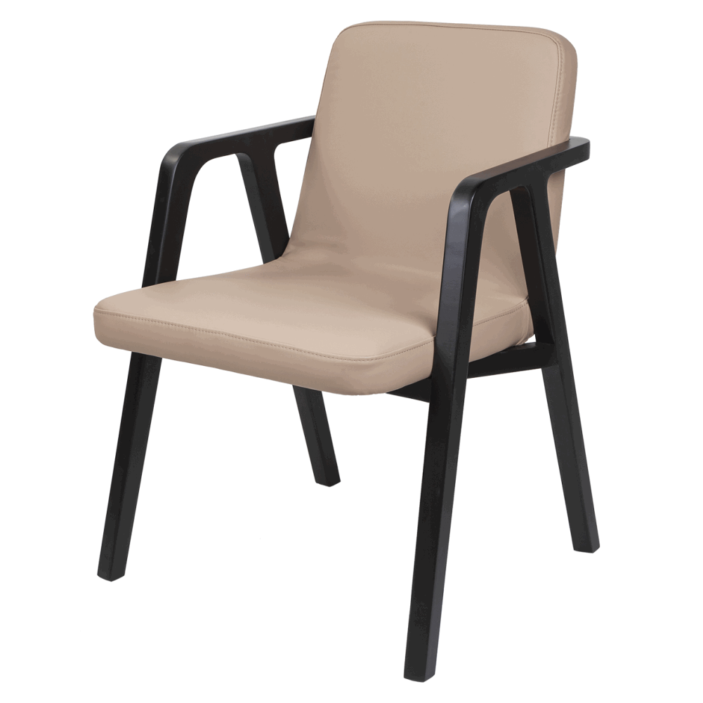Сиденье и спинка обиты гладкой эко-кожей — мягкой, приятной на ощупь и устойчивой к ежедневной эксплуатации. Цвет обивки добавляет тепла и визуального уюта, прекрасно контрастируя с тёмным основанием.