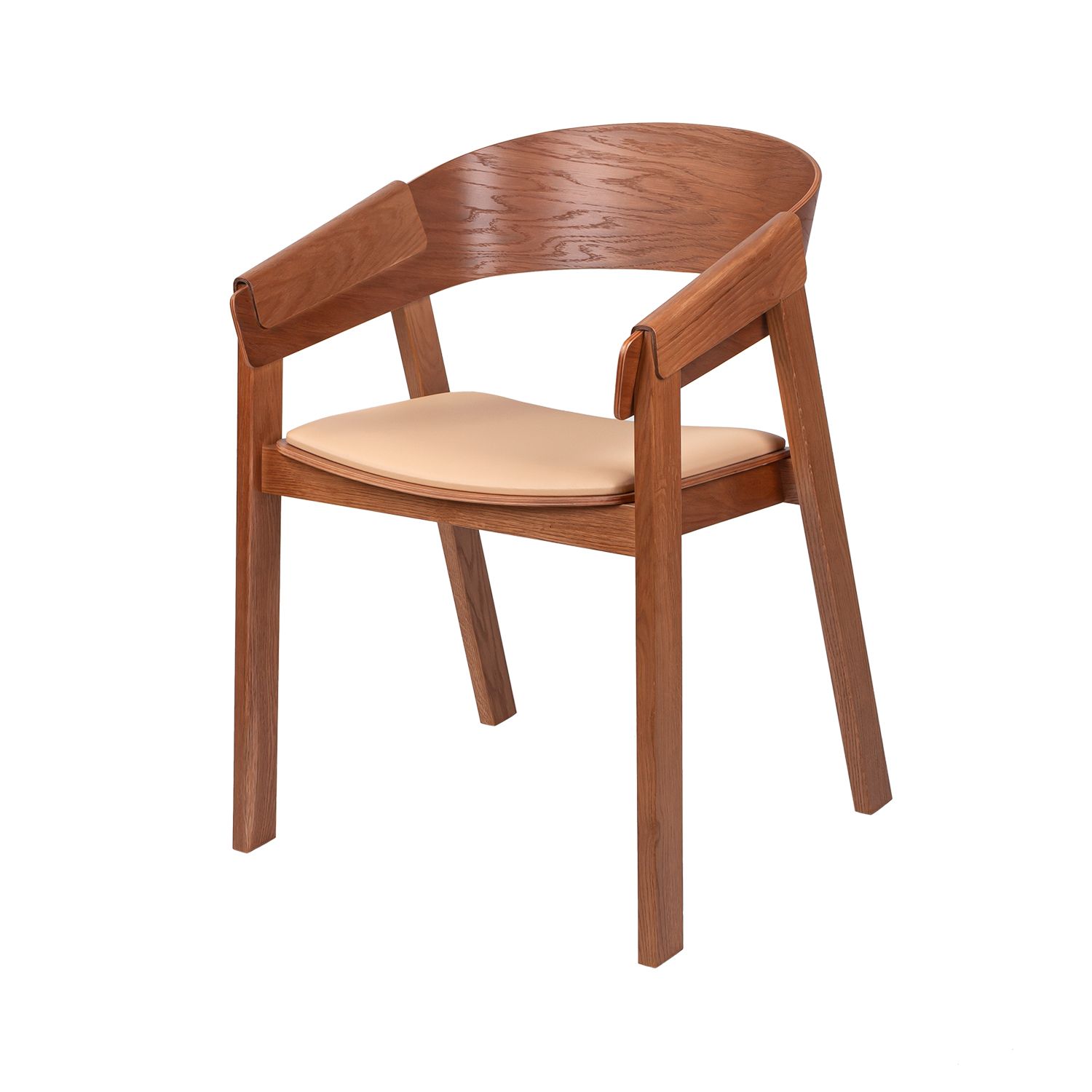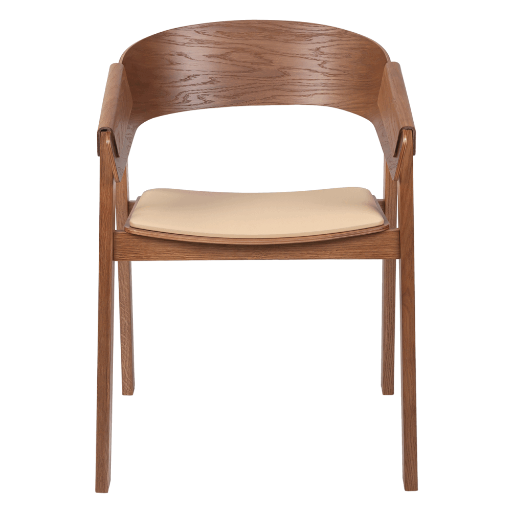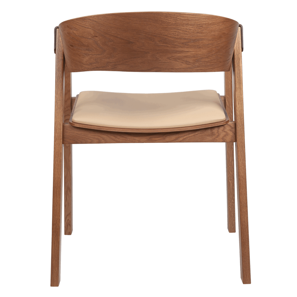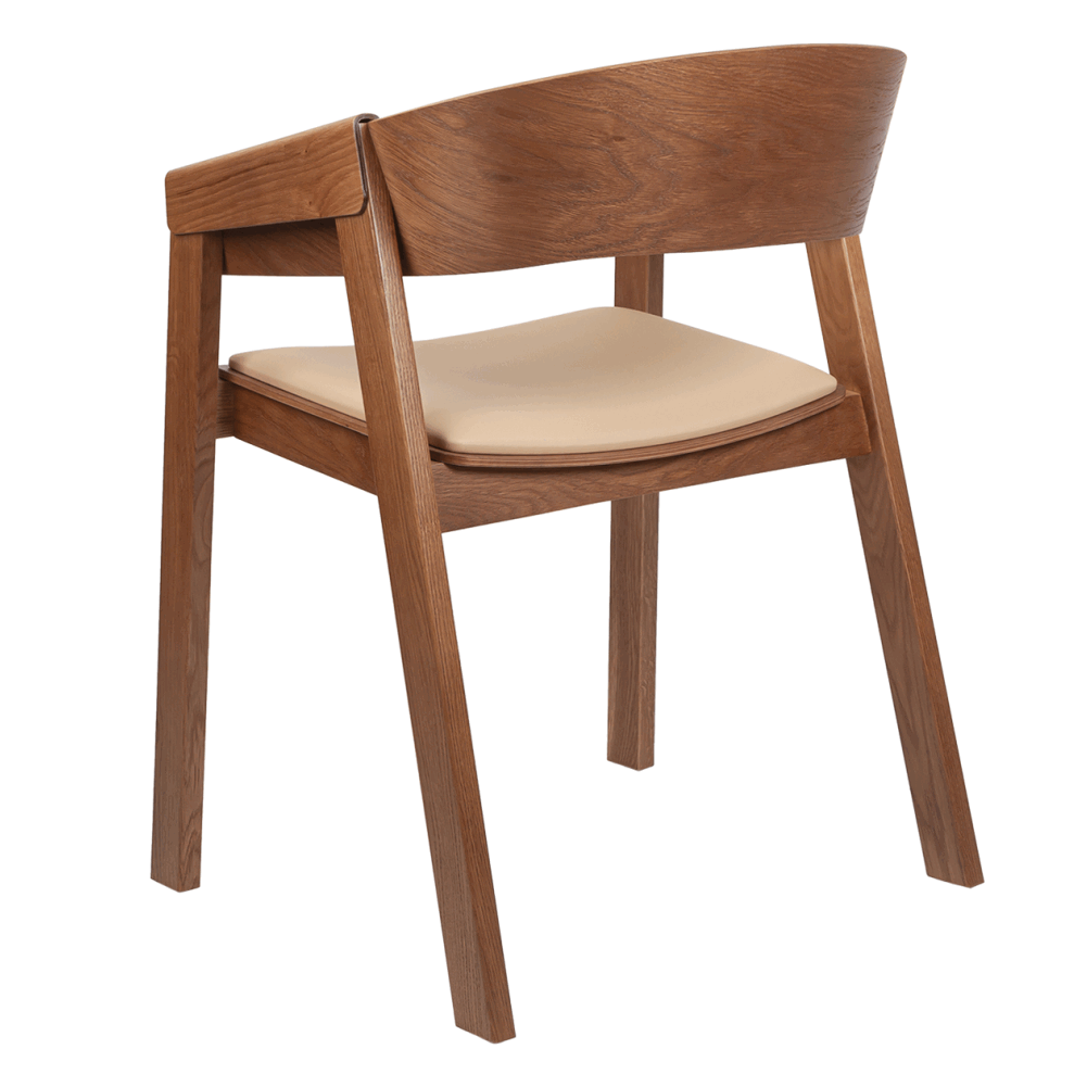Каркас выполнен из натурального дуба, окрашенного в глубокий коньячный оттенок. Фактура древесины подчёркивает теплоту материала, придаёт модели визуальную устойчивость и «землистость». Стул смотрится основательно, но при этом не перегружает пространство.