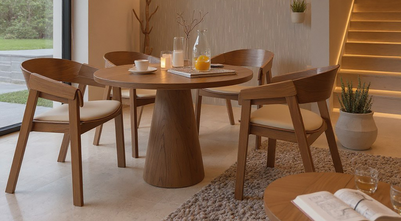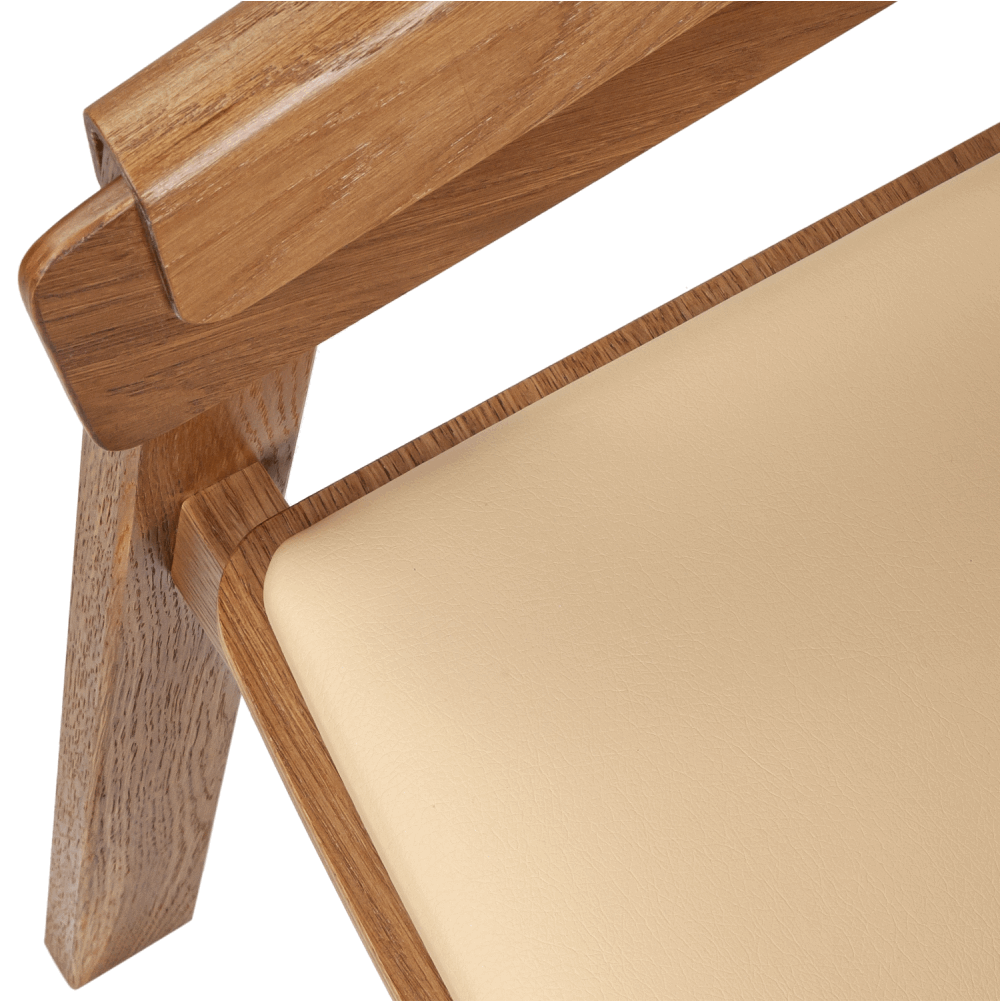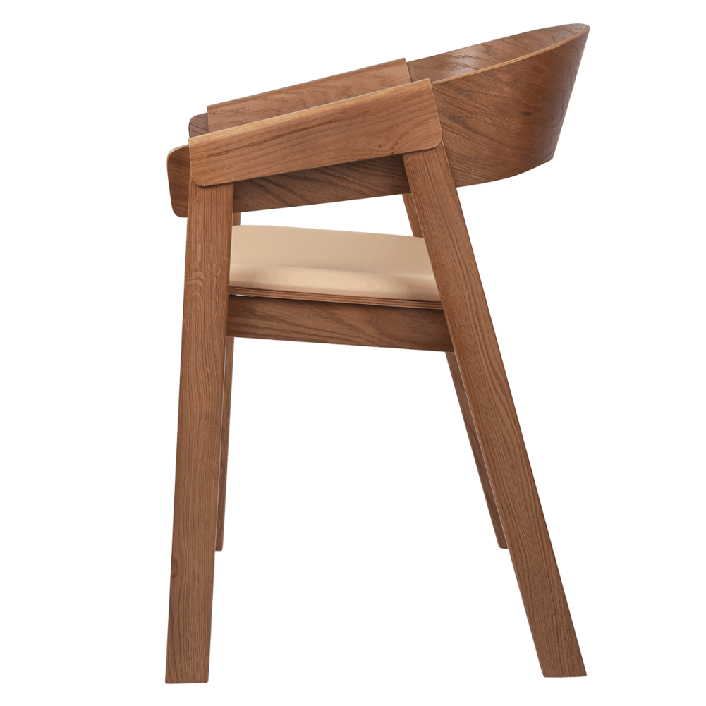 Каркас выполнен из натурального дуба, окрашенного в глубокий коньячный оттенок. Фактура древесины подчёркивает теплоту материала, придаёт модели визуальную устойчивость и «землистость». Стул смотрится основательно, но при этом не перегружает пространство.