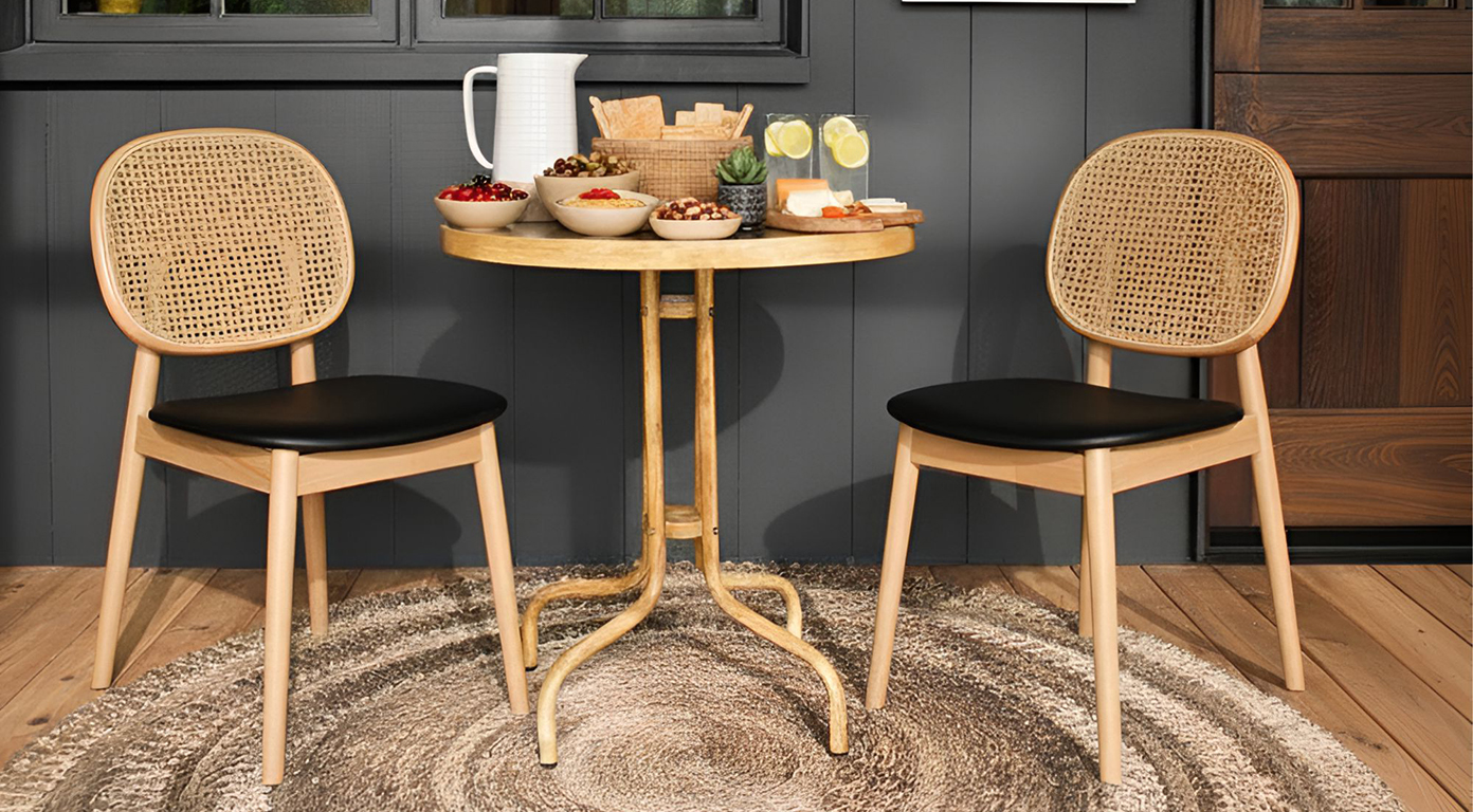 Изюминка модели — плетёная спинка из натурального ротанга. Она делает силуэт лёгким, воздушным и в то же время добавляет выразительности. Такое оформление отсылает к эстетике mid-century и скандинавскому модерну.