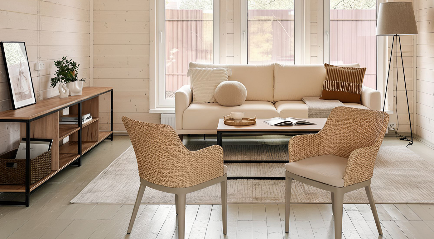 Обивка — текстильная, мягкая, в нейтральной гамме, дополнена плетёной спинкой из прочного синтетического роупа. Этот материал устойчив к влаге и истиранию, что делает модель подходящей как для внутреннего, так и для частичного уличного использования (под навесом, на террасах).